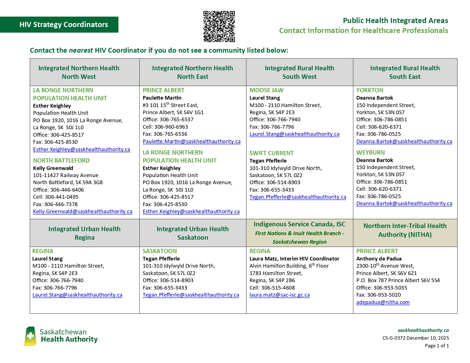 The HIV Strategy Coordinators work together and in collaboration with their local service area and other assigned areas, the Ministry of Health, SK HIV Collaborative, First Nations Inuit Health Branch (FNIHB), Northern Inter-Tribal Health Authority (NITHA), and other relevant stakeholders (including community-based partner organizations, peer advisors/programs, and others). The goals of the HIV Strategy Coordinators are: